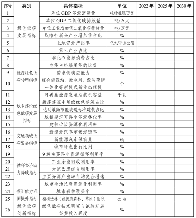 提出碳達(dá)峰試點(diǎn)工作的總體目標(biāo)和實(shí)施路徑,明確推進(jìn)碳達(dá)峰行動(dòng)的路線圖、施工圖,以及重點(diǎn)任務(wù)舉措等。視情提出重點(diǎn)領(lǐng)域、重點(diǎn)行業(yè)碳達(dá)峰試點(diǎn)目標(biāo)。可參考表1和表2列出的指標(biāo),并根據(jù)實(shí)際情況補(bǔ)充或刪減。