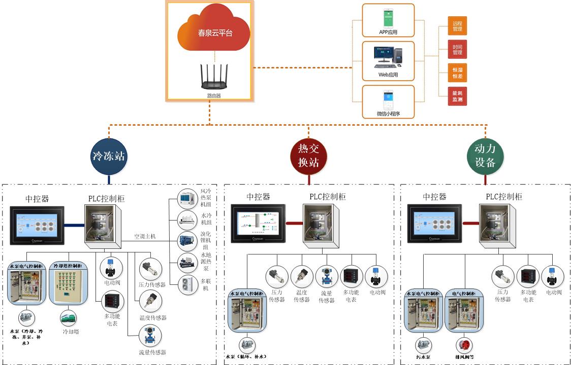 智慧動(dòng)力通過中控器、PLC將冷凍站(空調(diào)機(jī)房)或熱力站(熱源站、熱交換站)的動(dòng)力設(shè)備及系統(tǒng)接入智慧能源平臺(tái)進(jìn)行在線監(jiān)測(cè)、統(tǒng)一調(diào)度和智能化管控。一方面為冷凍站或熱交換站的安全高效運(yùn)行提供保障,另一方面實(shí)現(xiàn)了節(jié)能降耗、提升能效、節(jié)省運(yùn)行費(fèi)用之目的。