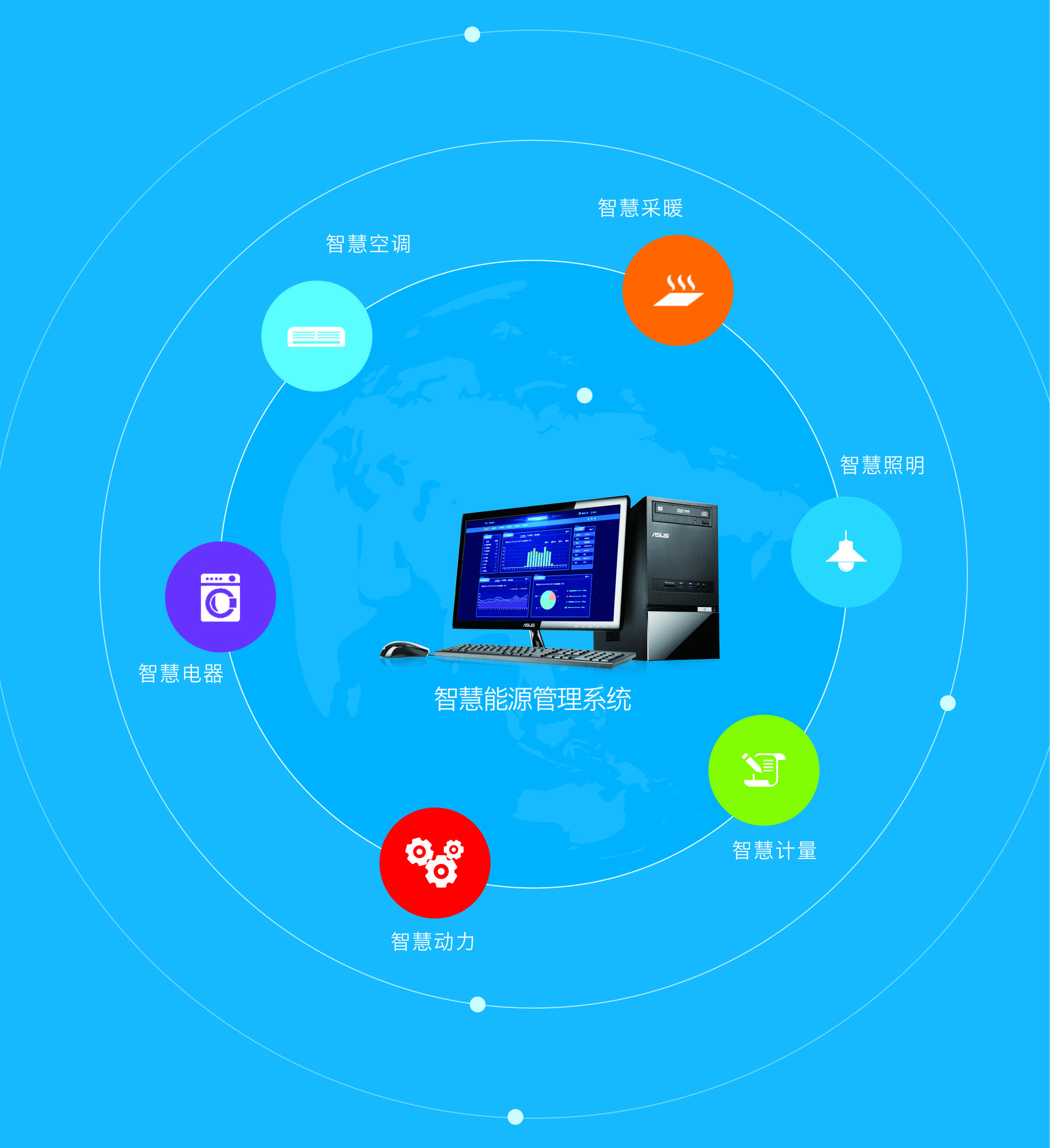 該系統(tǒng)集用能管控和微場景營造于一體,涵蓋“智慧空調(diào)、智慧采暖、智慧照明、智慧電器、智慧計量、智慧動力”等六大模塊,具有“能耗監(jiān)測、計量收費、節(jié)能管理、環(huán)境監(jiān)測、空氣改良”五大功能,應(yīng)用于“智慧節(jié)能政府、智慧節(jié)能校園、智慧節(jié)能醫(yī)院、智慧節(jié)能園
