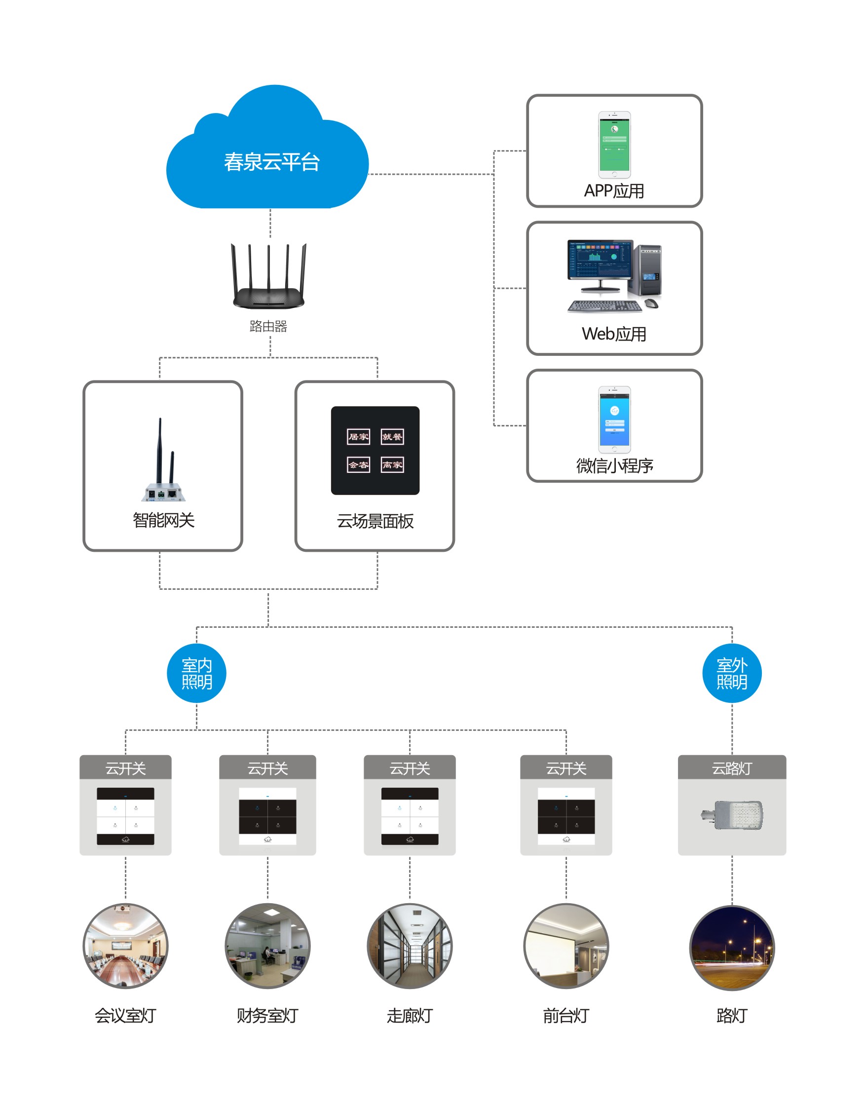 智慧照明通過云技術(shù)與照明相結(jié)合,不受空間和時(shí)間的限制實(shí)現(xiàn)照明的智能化管理,可減少單位物業(yè)的運(yùn)營成本,輕松實(shí)現(xiàn)集中管理和無人值守。智能終端產(chǎn)品包括應(yīng)用于室內(nèi)照明的云開關(guān)和室外照明的云路燈。